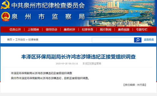 5月28日讯 据泉州市纪律检查委员会网站,28日,泉州市丰泽区环保局副局长许鸿志涉嫌违纪,目前正接受组织调查。