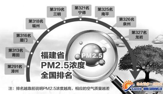 厦门网-海西晨报讯(记者 曾昊然)日前,环保部与环保组织发布了2015年一季度空气PM2.5浓度排行榜,全国共有360座城市受到监测并参与排名。其中,厦门PM2.5浓度均 值为41微克/立方米,未达国家空气质量二级标准,pm2.5浓度均值排在全省所有城市第三名。