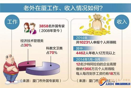 至于收入,根据厦门市地方税务局的统计,在厦外国人高工资收入者不少,且有不断增加的趋势。从2014年申报个人所得税的1万多名外籍人士来 看,有4462名外籍人员申办12万元以上纳税人自行纳税申报项目,比2013年多了近一百人。这也意味着,四成以上的纳税外籍人士每月工资过万元。其 中,2014年前9个月,就有12名来自沙特阿拉伯的企业高管,仅个人所得税就缴纳了1366万元。也就是说,这些人每人每月所缴纳的个税达到12万元, 推算每月到手工资大概有18万元。